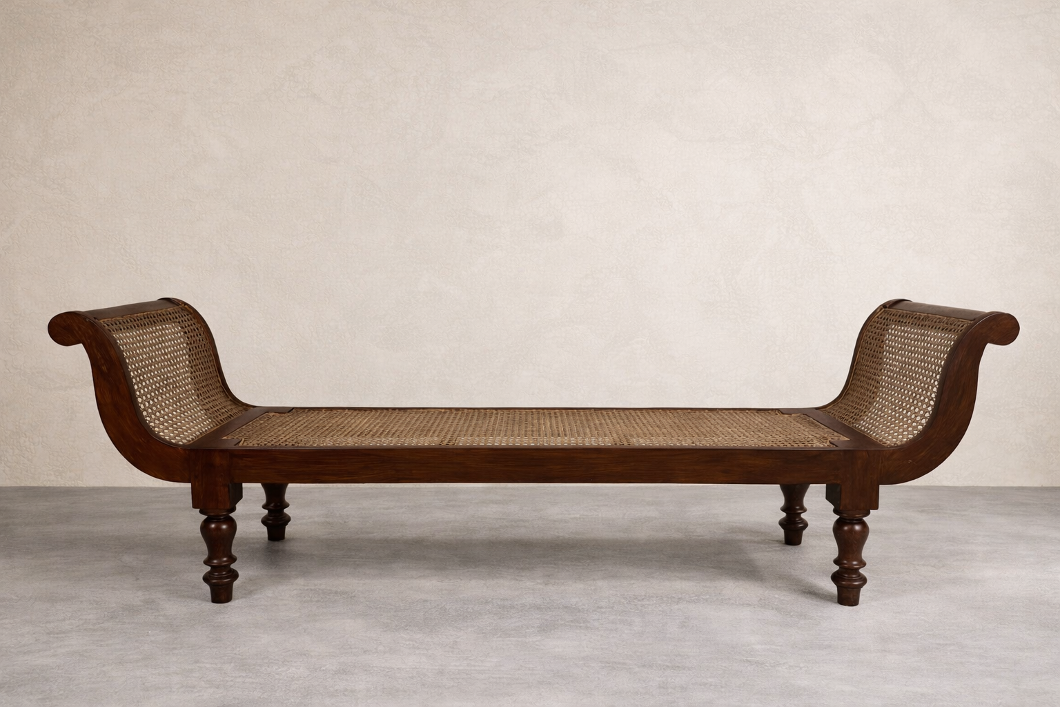The Mira Entry Bench is a graceful expression of heritage craftsmanship and refined elegance. Handcrafted from solid teak wood by skilled artisans, this sculptural piece features softly curved arms, hand-woven cane panels, and beautifully turned legs inspired by traditional South Indian design. Its rich, warm finish highlights the natural depth of the wood grain, while the woven cane seat offers comfort and visual lightness. Designed to make a statement without overwhelming a space, the Mira Entry Bench brings a sense of welcome, artistry, and timeless character to entryways, hallways, or the foot of a bed — reflecting Aashaari’s commitment to natural materials, artisanal excellence, and enduring design.