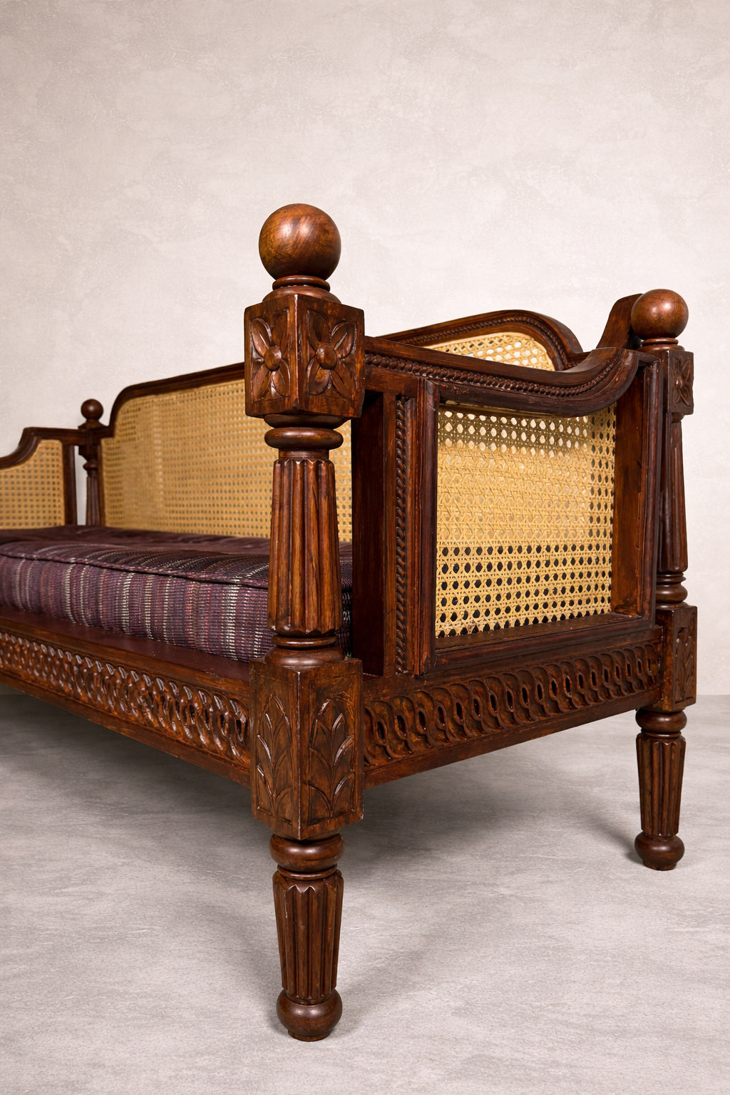 The Aarya Daybed is a refined expression of heritage craftsmanship and timeless luxury. Handcrafted from solid teak wood by skilled artisans, it features intricately carved posts, sculpted detailing, and traditional woven cane panels that reflect the richness of South Indian design. Its warm natural finish enhances the beauty of the wood grain, while the graceful silhouette and generous proportions create a sense of understated grandeur. Designed for both comfort and visual presence, this heirloom-quality piece embodies Aashaari’s commitment to artisanal excellence, natural materials, and enduring design.